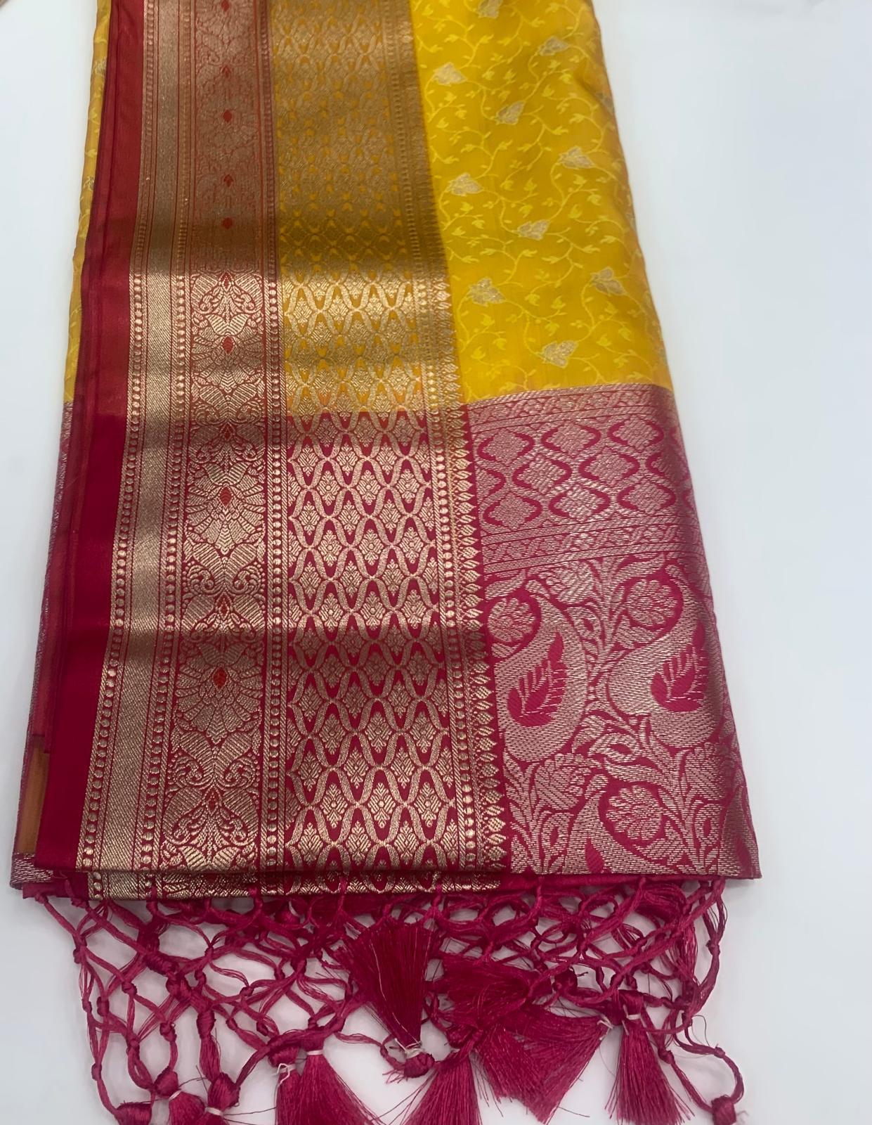 Stunning mustard yellow and pink traditional looking saree.Wedding saree. Beautiful self imposed design blouse piece and rich pall.
